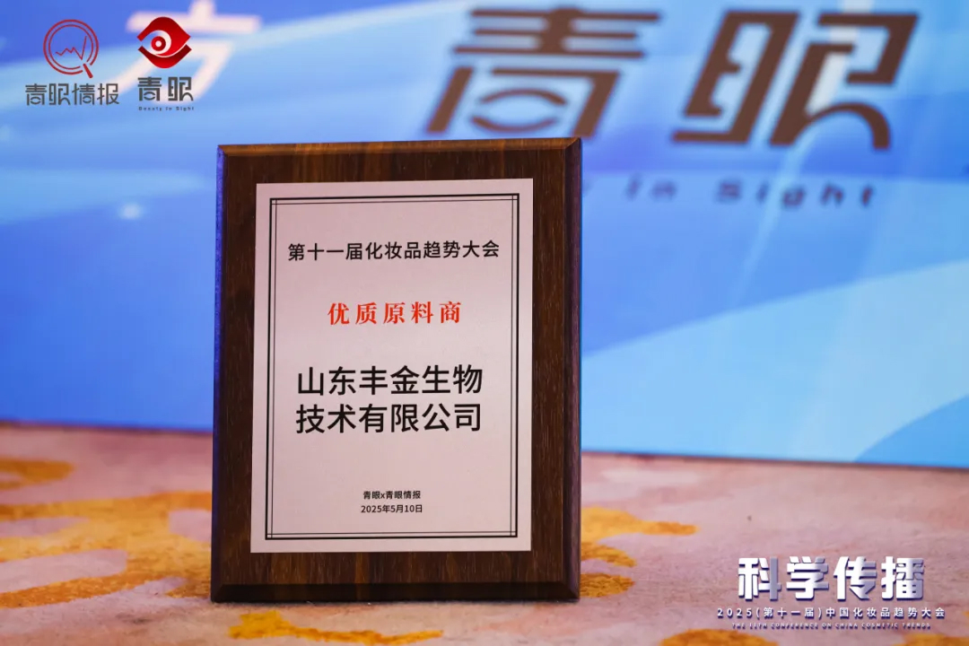 豐金生物以聚谷氨酸鈉為支點,以“結(jié)構(gòu)創(chuàng)新”突破傳統(tǒng)成分瓶頸,打破行業(yè)同質(zhì)化,撬動美妝科技革新,榮獲此次大會“優(yōu)質(zhì)原料商”獎。